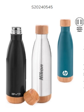 Head Eco Bottle com 500ml de capacidade. Bottle personalizado com a sua marca, produzido de metal e tampa de rosca em madeira de bambu com vedação de silicone. Brinde ecológico para presentear seus clientes ou a sua equipe com hidratação e sustentabilidade. Grave já a sua!